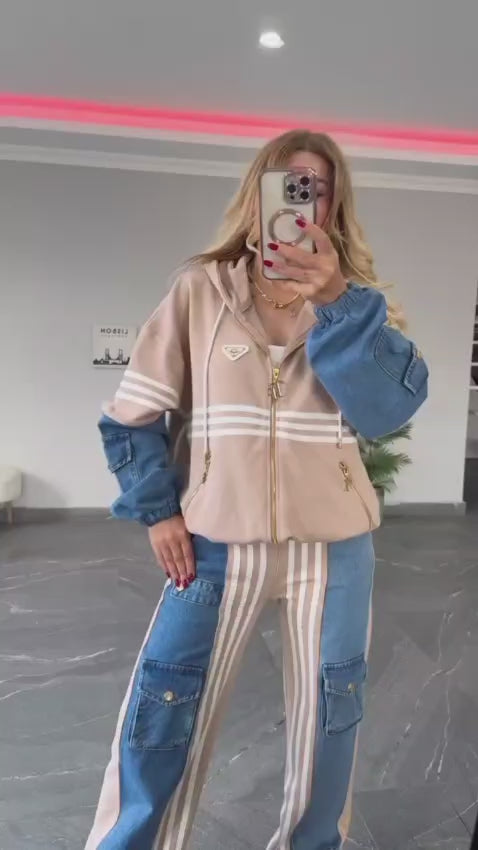 Compleu Damă Sport-Chic cu Inserții Denim – Hanorac & Pantaloni Largi