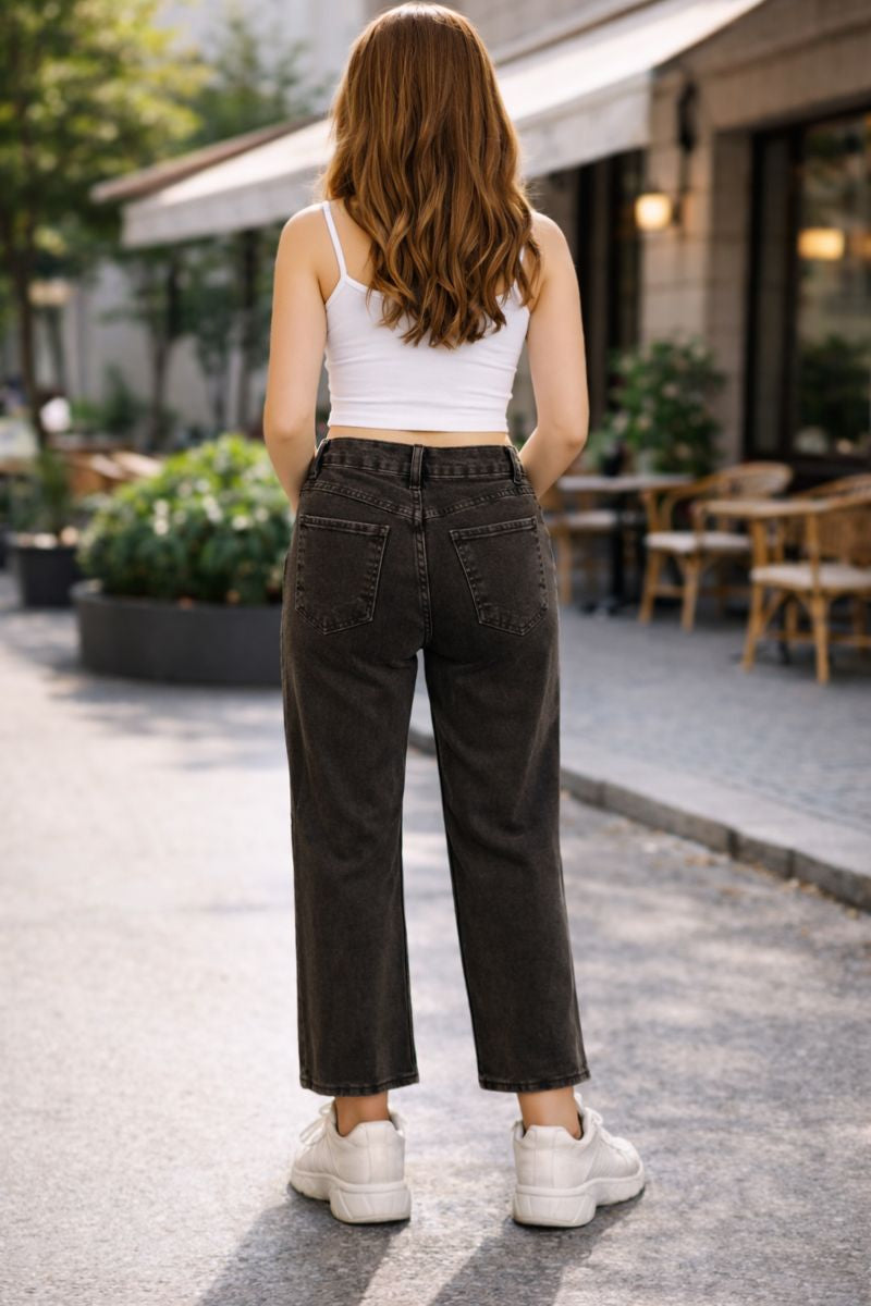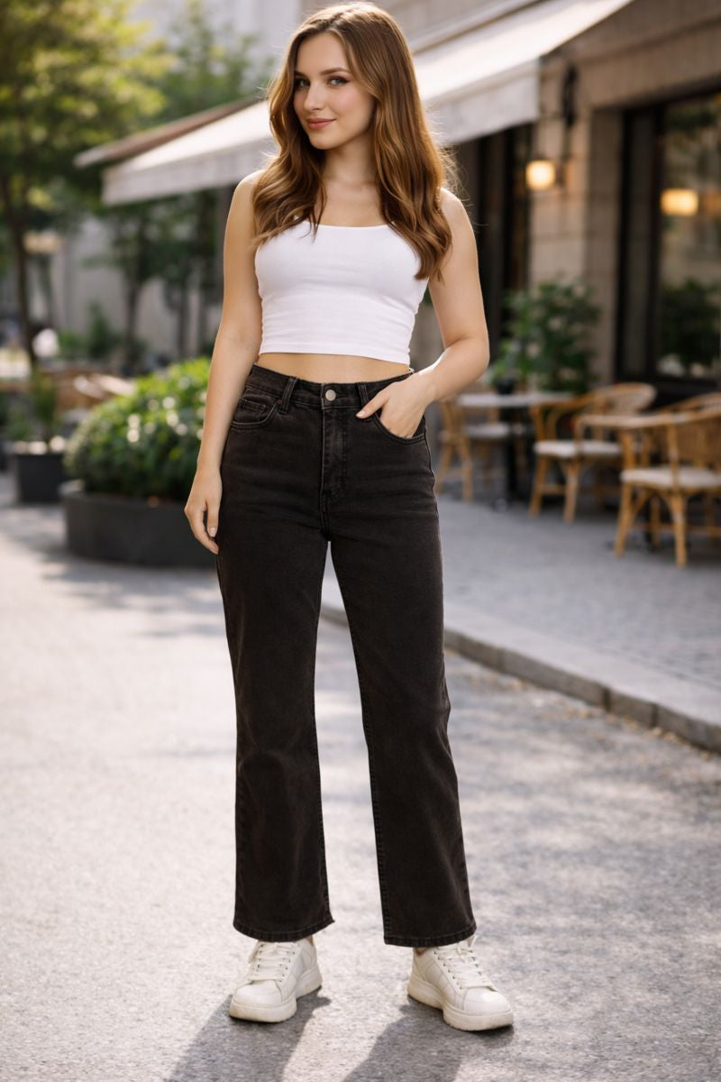 Blugi damă negri cu talie înaltă și croială dreaptă. Stil natural, lungime clasică și confort zilnic – ușor de asortat în orice ținută.